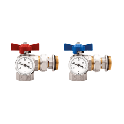 Kuleventilsett albue til fordeler med termometer utvendig 1", Wermgo
