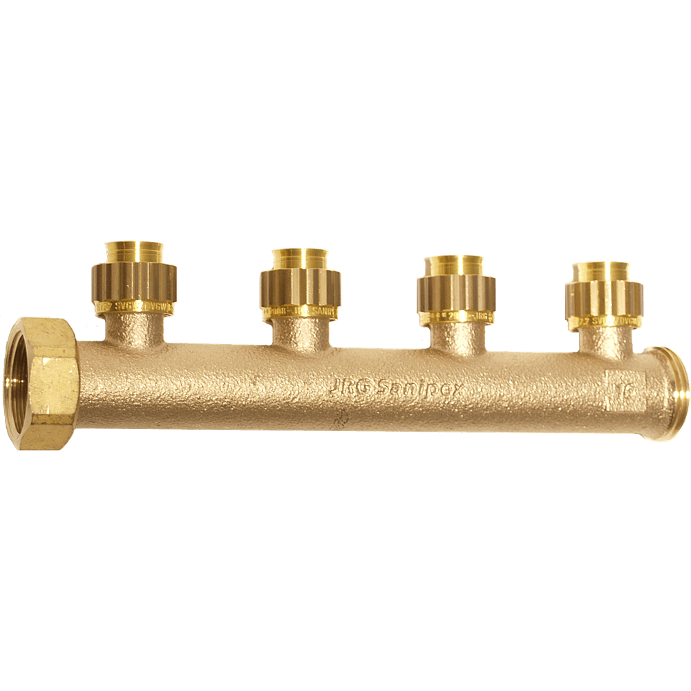 Sanipex 16 mm fordeler benyttes for å bygge samlestokk i radiatorsystemet. Fordeleren leveres med 1 til 5 uttak i dimensjonen 16 mm. Delen er bronsjestøpt med 1" løsmutter og 1" gjenge. Systemets pakning skal ikke tilføres noen form for olje eller grease.
