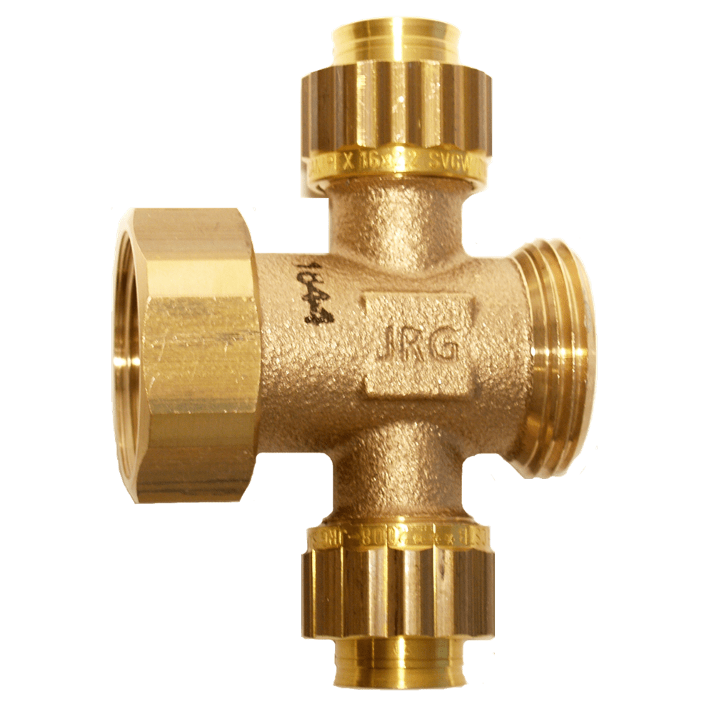 Fordeler 1+1 brukes for å distrubere vann til riktig tappested. Fordelerne leveres i dimensjonen 12 og 16mm Delen er bronsjestøpt med 1" løsmutter og 1" gjenge. Systemets pakning skal ikke tilføres noen form for olje eller grease.