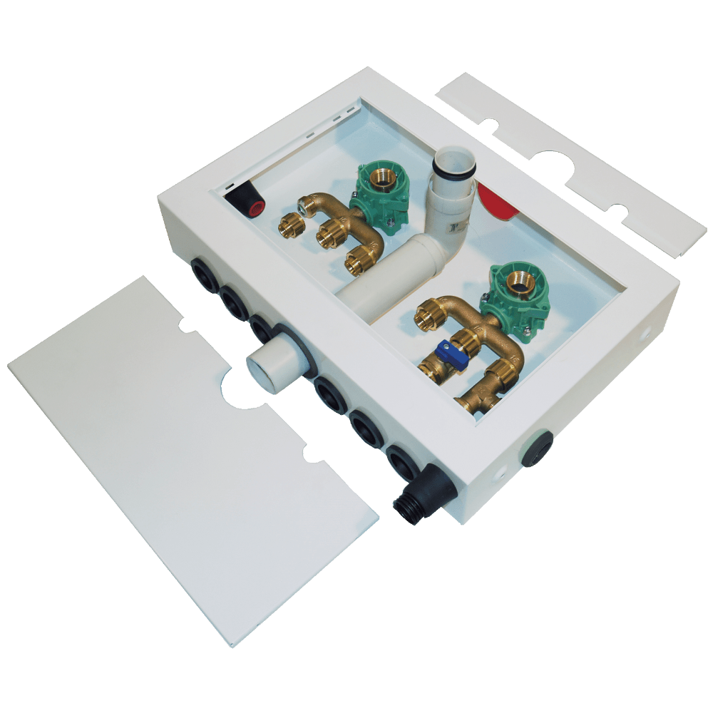 Sanipex miniskap leveres i hvitlakkert aluminium med ferdig monterte rørgjennomføringer, veggbokser og avløpsbend m/siklemikk. Veggboksene leveres i 16mm x1/2". Miniskap m/2 tripple veggbokser, mål: 448x318x79,5 Fargekode på skap: NCS 0500 glans 80